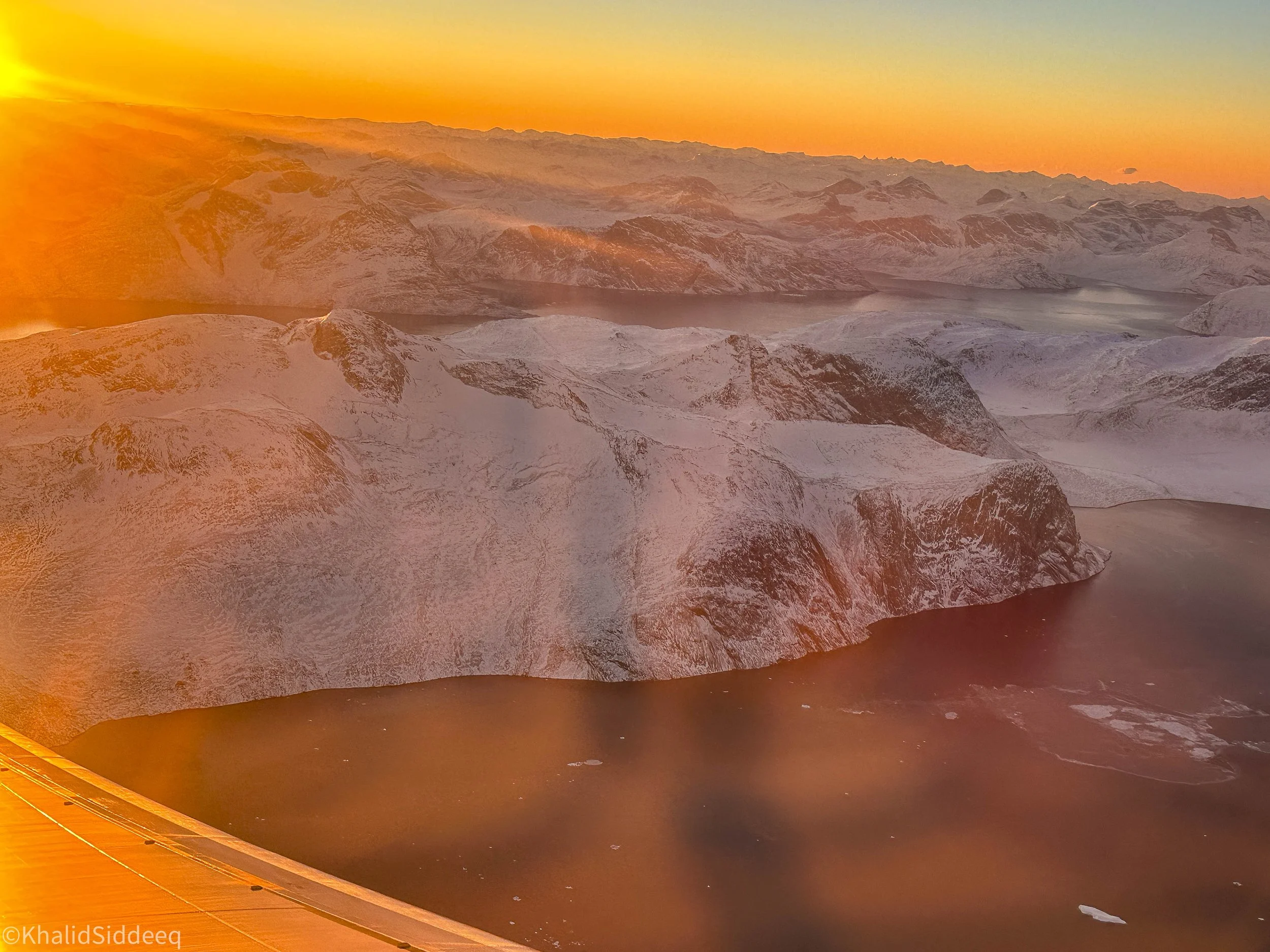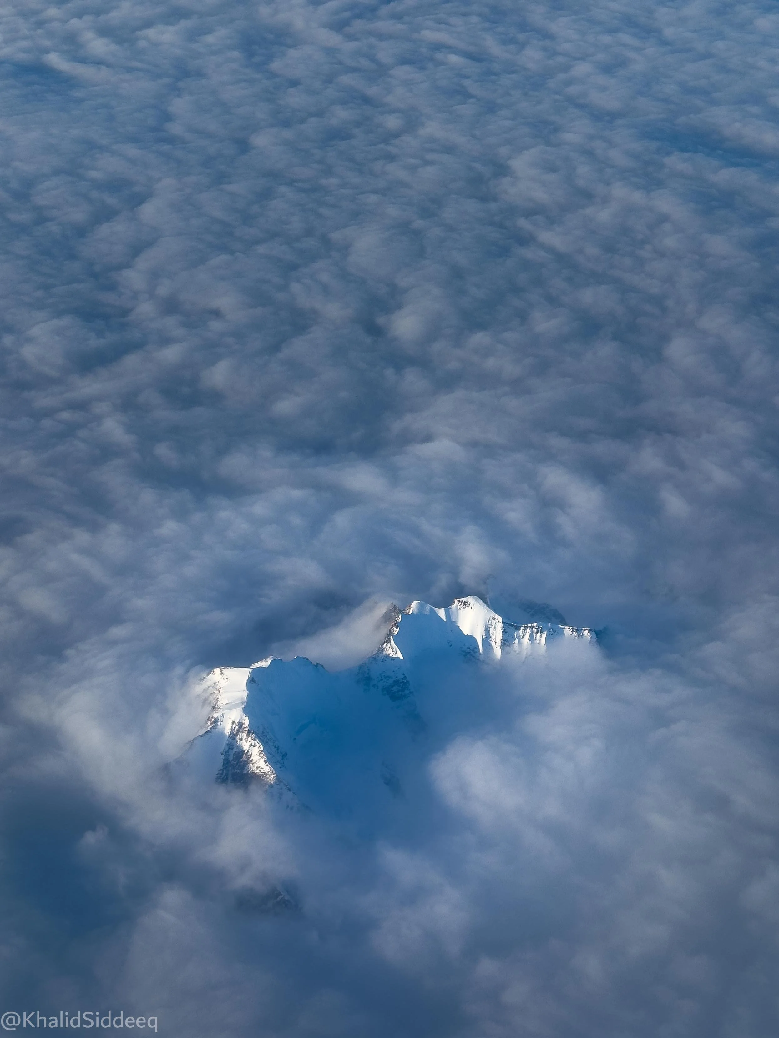 هذا المنظر البديع من نافذة الطائرة، لقمة جبل أبيض اللون اخترق السحب، بينما ترى الناطحات تخترق السحب في المدن العصرية، ترى الجبال تخترق السحب في جرينلاند